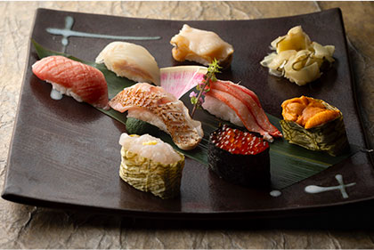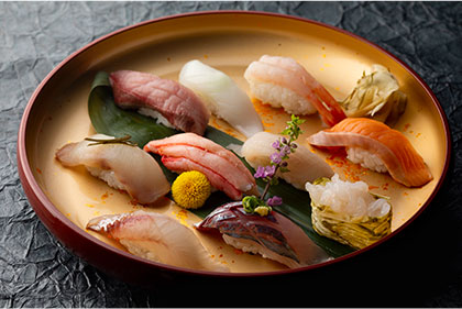為了支持富山縣的「壽司就是,富山」項目,我們採用了「壽司x富山的傳統工藝品」為主題,並使用了採用高岡青銅器技術的鋁鑄件展示壽司的盤子來自富山縣富山市,讓客人體驗富山的製造文化。